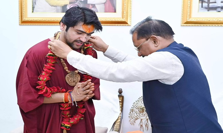 रायपुर। मुख्यमंत्री विष्णुदेव साय (CM Vishnudev Sai) ने आज अपने निवास में बागेश्वर धाम के पीठाधीश्वर पंडित धीरेंद्र शास्त्री से प्रदेशवासियों की सुख-समृद्धि और खुशहाली के लिए आशीर्वाद ग्रहण किया। मुख्यमंत्री साय (CM Vishnudev Sai) ने पं. धीरेंद्र शास्त्री के अपने निवास पहुंचने पर उन्हें शाल-श्रीफल भेंटकर उनका का आत्मीय स्वागत किया।
