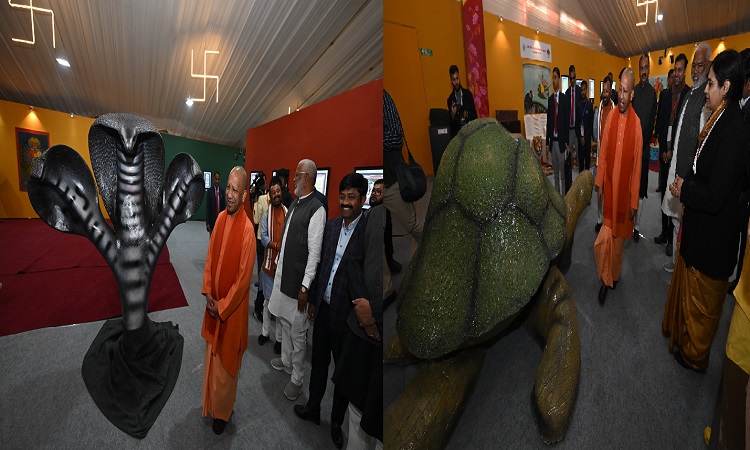महाकुम्भ नगर। मुख्यमंत्री (CM Yogi) ने सेक्टर 7 में तैयार किए गए कला कुम्भ (Kala Kumbh) का भी शुभारंभ किया। यूपी स्टेट पवेलियन का शुभारंभ करने के बाद सीएम योगी ठीक सामने बने कला कुम्भ पहुंचे और यहां उन्होंने उत्तर प्रदेश संस्कृति विभाग के द्वारा निर्मित इस अनूठे शिविर का अवलोकन किया। परिसर में विभिन्न सांस्कृतिक झांकियों के बीच सीएम योगी ने फीता काटकर परिसर का उद्घाटन किया। निरीक्षण के दौरान उन्होंने हॉल में मौजूद कलाकृतियों के विषय में भी जानकारी प्राप्त की, जबकि थ्रीडी के माध्यम से कला कुम्भ से संबंधित वीडियो भी देखा। यहां से मुख्यमंत्री (CM Yogi) सीधे प्रदर्शनी हॉल में गए, जहां उन्होंने सजाई गई अनूठी कलाकृतियों, विभिन्न मंदिरों की रेप्लिका और प्रदर्शनी को सराहा। उन्होंने कला कुम्भ को कुम्भ के विकास का प्रमाणिक दस्तावेज करार दिया। इस दौरान प्रमुख सचिव पर्यटन एवं संस्कृति मुकेश मेश्राम ने उन्हें स्मृति चिन्ह भी भेंट किया।