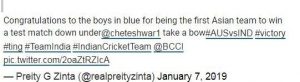प्रिटी जिंटा ने टीम इंडिया को जीत की बधाई देते हुए लिखा था- टीम इंडिया को बधाई, टेस्ट मैच जीतने वाली पहली एशियन टीम।