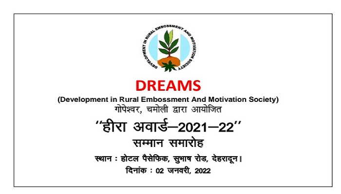 देहरादून। राजधानी देहरादून में ड्रीम्स संस्था (डेप्लवमेंट इन रूलर एम्बोसमेंट एंड मोटिवेसन सोसायटी) द्वारा ‘‘हीरा अवार्ड-2021’’ (Heera Award-2021) का भव्य आयोजन कल 2 दिसंबर दिन-रविवार को शाम 4 बजकर 30 मिनट पर देहरादून के कनक चौक स्थित पैसेफिक होटल में किया जा रहा है।